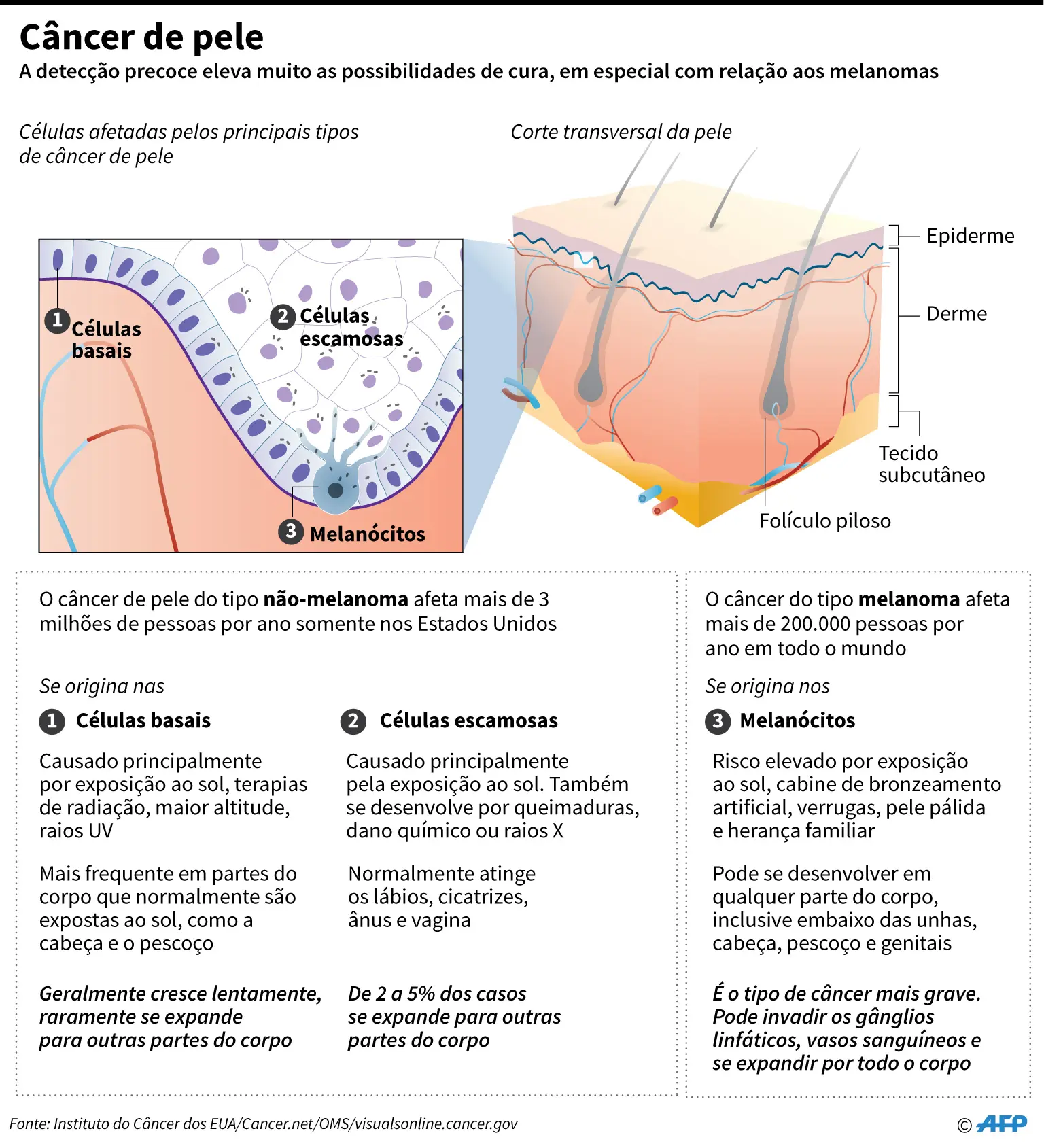 Exposição excessiva ao sol – principal fator de risco -, cabelos e olhos claros, sardas, história prévia de câncer de pele na família e pintas escuras pelo corpo devem ser observados e investigados por um médico, advertiu. O diagnóstico precoce possibilita uma alta chance de cura na fase inicial do câncer de pele. Os médicos recomendam o autoexame e que conheçam suas pintas, verificando assimetria, borda, cor e diâmetro. Ao identificar algo diferente, a orientação é buscar um dermatologista e fazer uma avaliação.