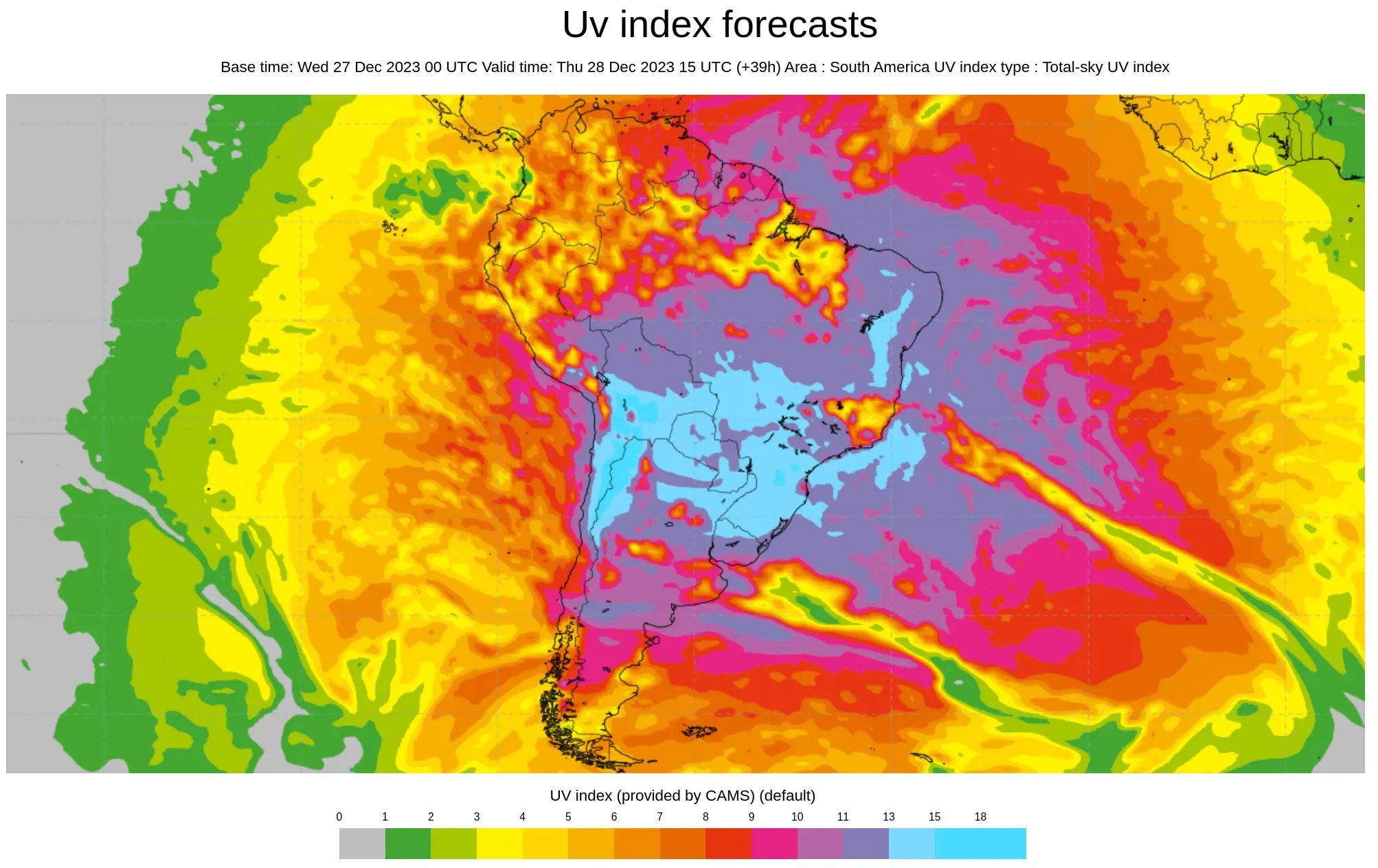 O mapa acima mostra a projeção do índice UV para o meio-dia desta quinta-feira com base no modelo CAMS, do Sistema Copernicus, da União Europeia. Grande parte do Sul do Brasil terá no horário índices de raios ultravioleta em valores extremos, ao redor ou acima de 15.