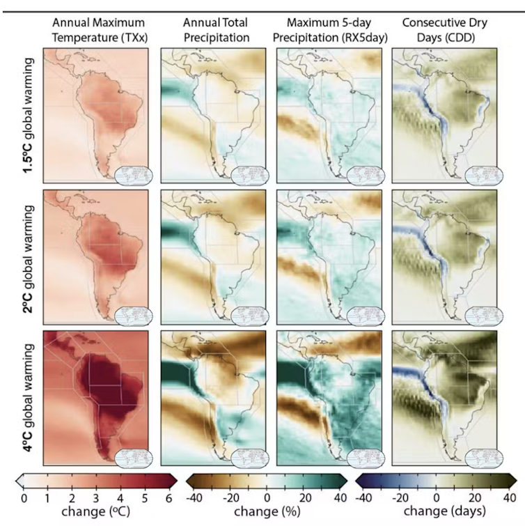 Mudanças previstas pelo 6º Relatório de Avaliação do IPCC para a América do Sul: temperatura máxima anual (TXx), precipitação total anual, precipitação máxima anual de 5 dias (RX5day) e dias secos consecutivos anuais (CDD) a 1,5°C, 2°C e 4°C de aquecimento global em relação a 1850-1900. Os cenários nas duas primeiras linhas (1,5°C e 2°C) pressupõem grandes reduções nas emissões globais. IPCC