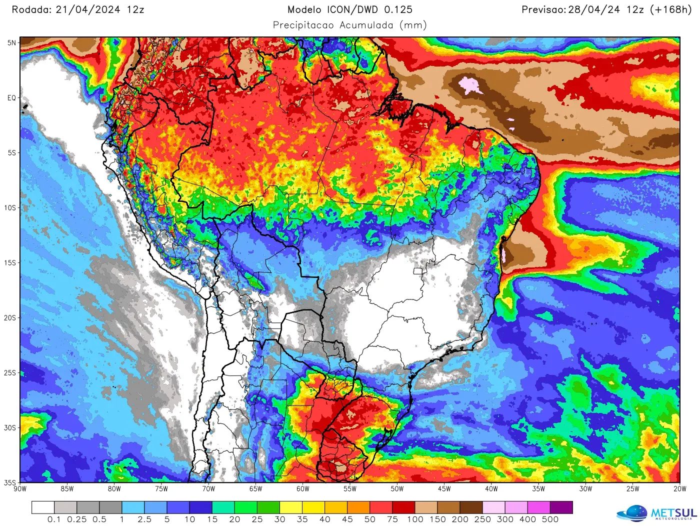 O mapa acima mostra a projeção de chuva para esta semana do modelo meteorológico alemão Icon, disponível ao assinante na seção de mapas (assine aqui). No mapa, vê-se a tendência de precipitações mais abundantes em latitudes mais ao Norte do Brasil assim como em setores mais ao Sul do território nacional.