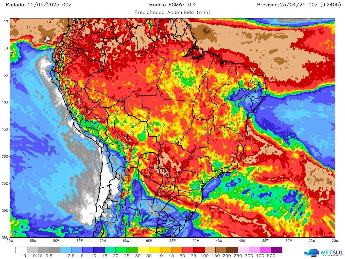 O mapa acima mostra a projeção de chuva para dez dias do modelo do Centro Meteorológico Europeu (ECMWF), que está disponível ao assinante (assine aqui) em nossa seção de mapas.