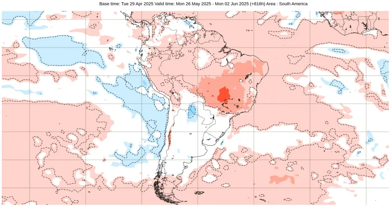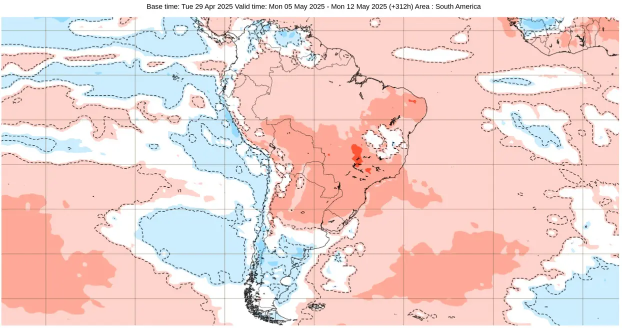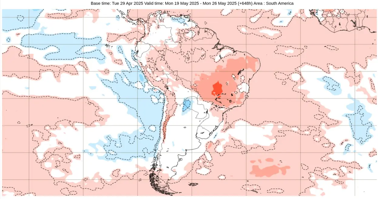 Os mapas abaixo mostram as projeções de anomalia (desvio da média) de temperatura semana a semana do Centro Meteorológico Europeu (ECMWF), em que se observa como a tendência é de temperaturas predominantemente acima da média no decorrer do mês no Centro-Oeste, Sudeste e Sul do Brasil.