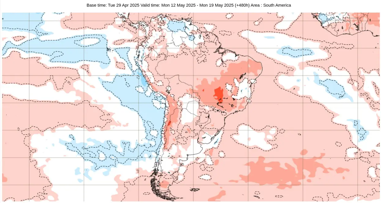 Por outro lado, a região Niño 1+2, perto das costas do Equador e do Peru, estava com anomalia de -0,3ºC depois de semanas de um El Niño Costeiro que chegou ao fim muito abruptamente na segunda quinzena de abril.