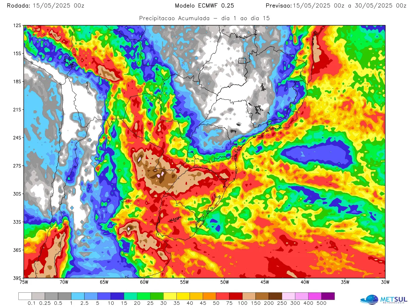 Projeção de chuva do modelo europeu ECMWF para os próximos 15 dias | METSUL