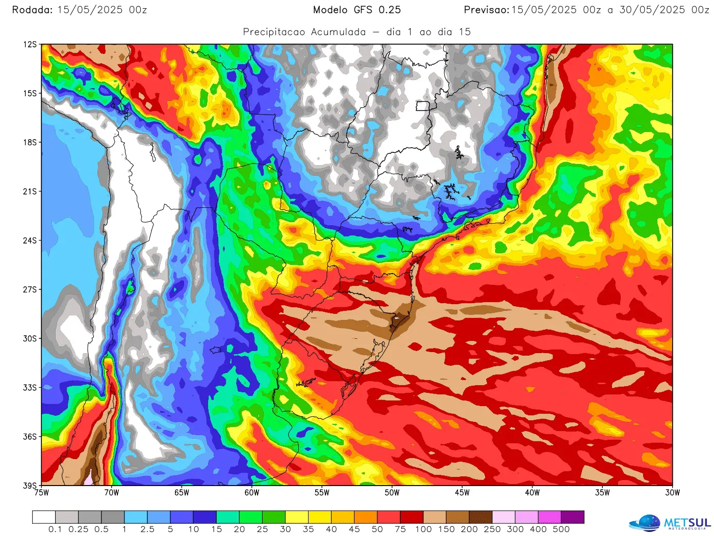Projeção de chuva do modelo norte-americano GFS para os próximos 15 dias | METSUL