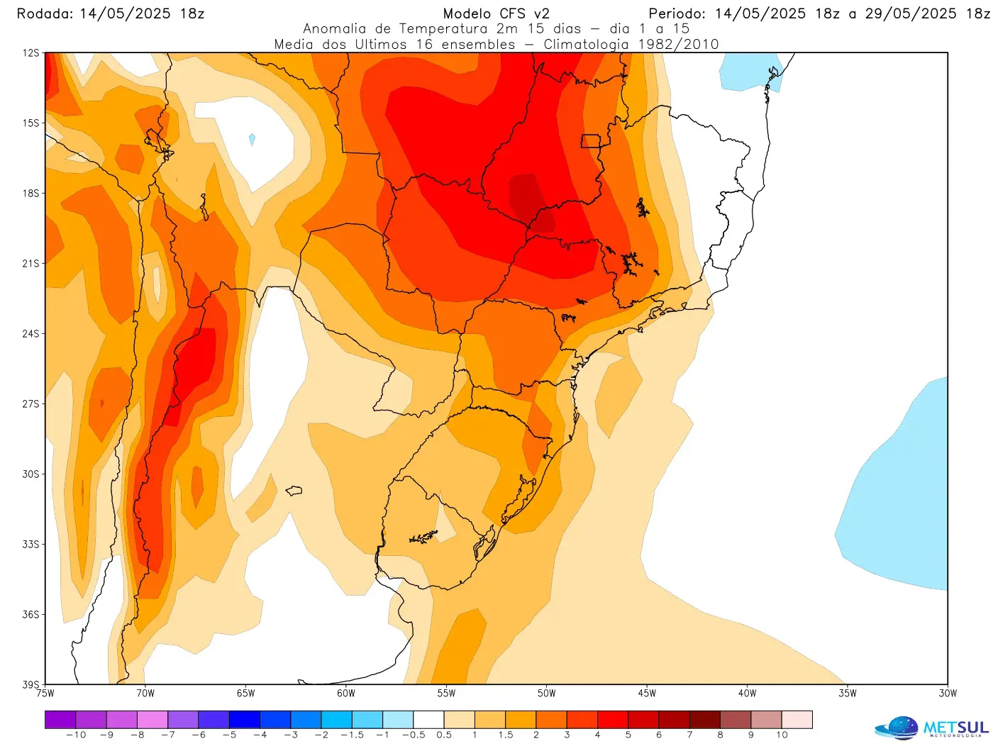 O período entre 16 e 20 de maio, inclusive, será marcado pela influência de ar quente com sucessivos dias de temperaturas muito acima da climatologia histórica e calor fora de época, o que vai influenciar muito na média da quinzena.