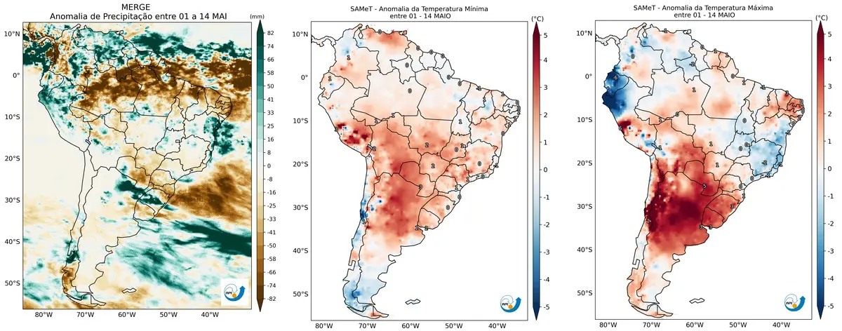 As mínimas até agora no mês estão acima da média em quase todo o Centro-Oeste, Sul e Sudeste, excetuando-se alguns ponto perto da costa. Já as máximas estão acima ou muito acima da média na maioria das áreas do Centro-Sul brasileiro. Minas Gerais, Rio de Janeiro e Espírito Santo estão com máximas inferiores ao normal enquanto o Rio Grande do Sul tem máximas muito acima da média de maio.