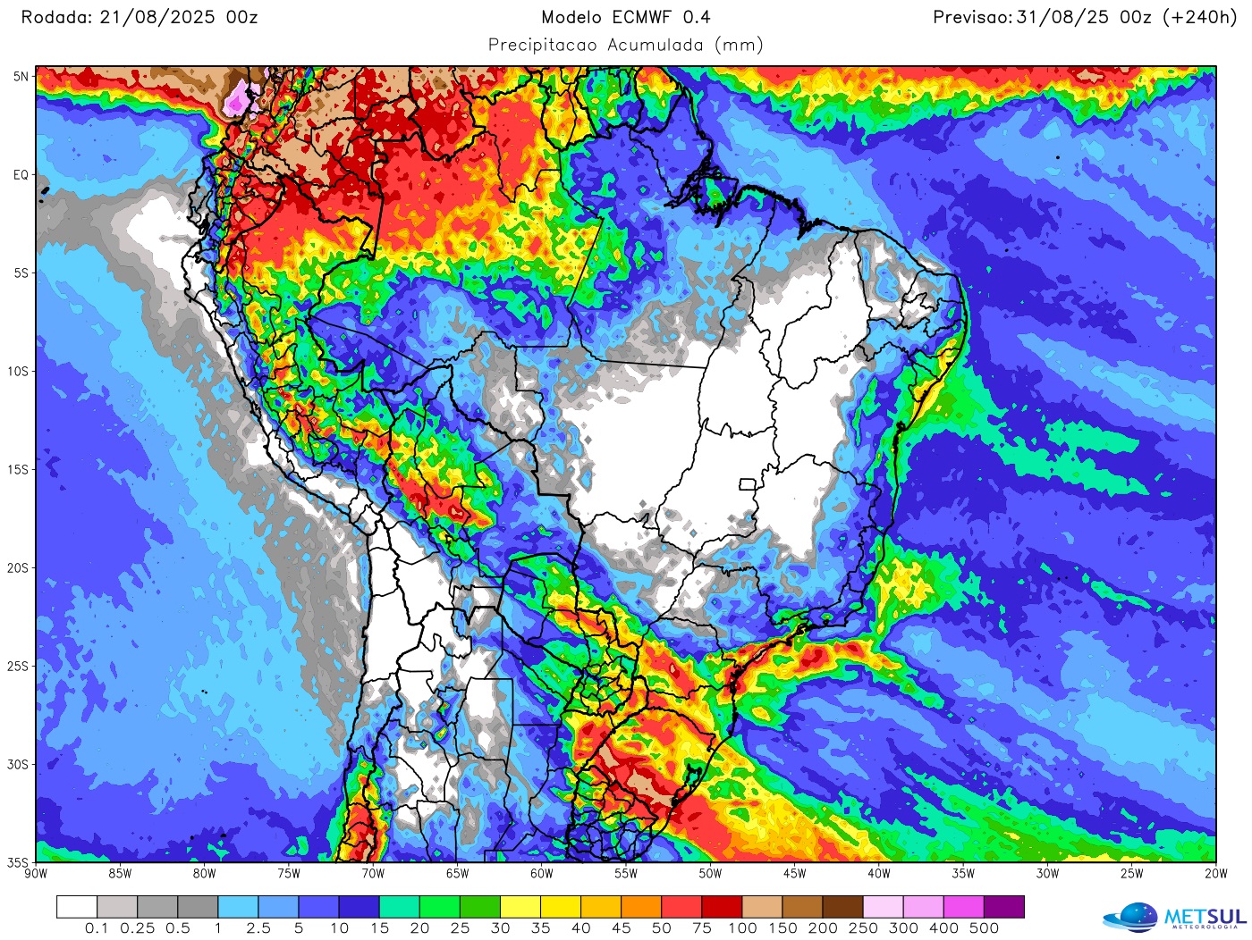 A chuva no Brasil nos próximos dez dias terá os maiores volumes de chuva no Sul do país, onde os acumulados podem ser altos com marcas até acima de 100 mm em pontos da região.