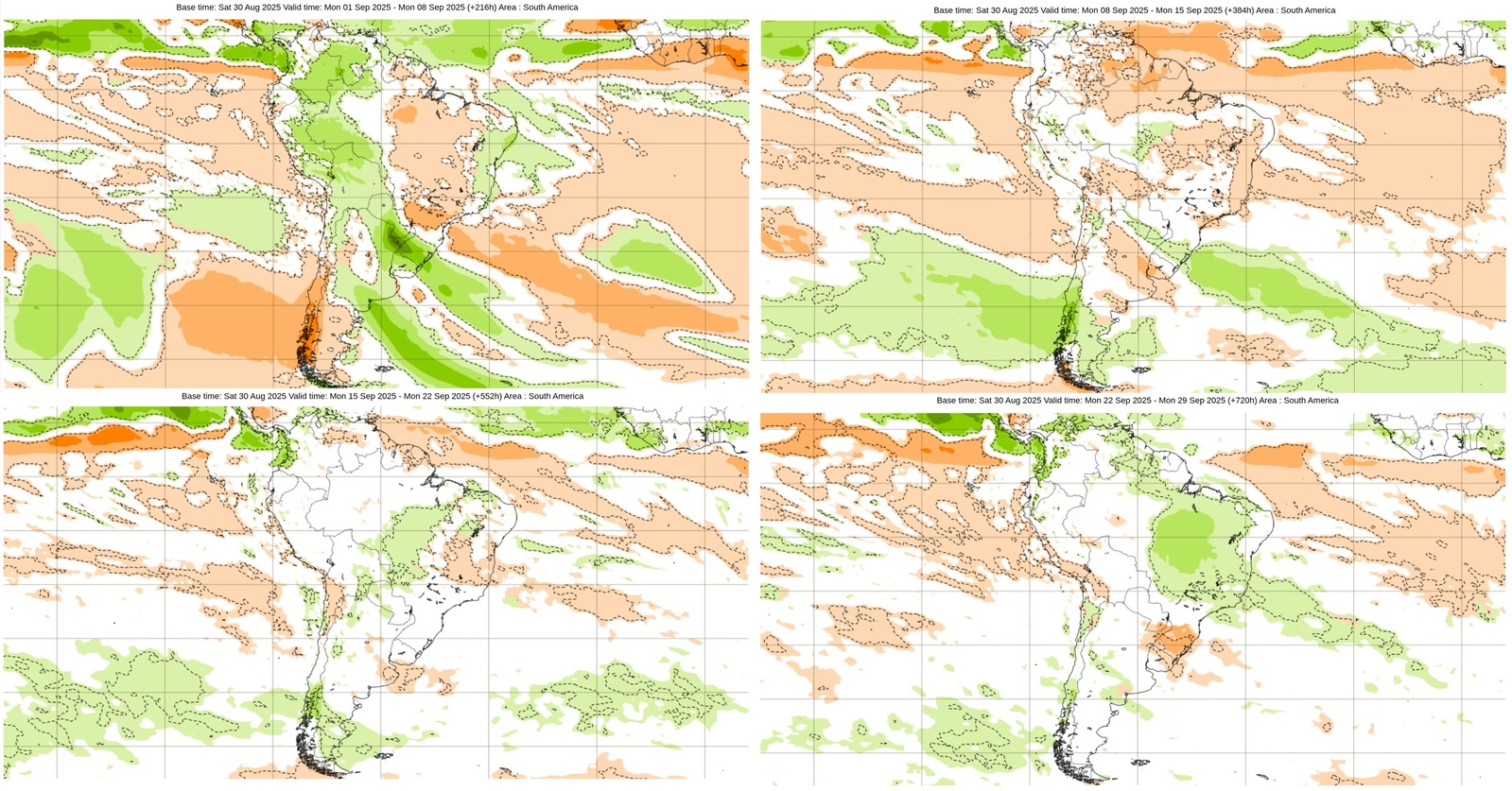 Os mapas abaixo trazem a projeção de anomalia de chuva semana por semana para grande parte de setembro do modelo de clima do Centro Meteorológico Europeu (ECMWF) em que se constata a tendência de aumento da instabilidade no Sudeste no fim do mês.