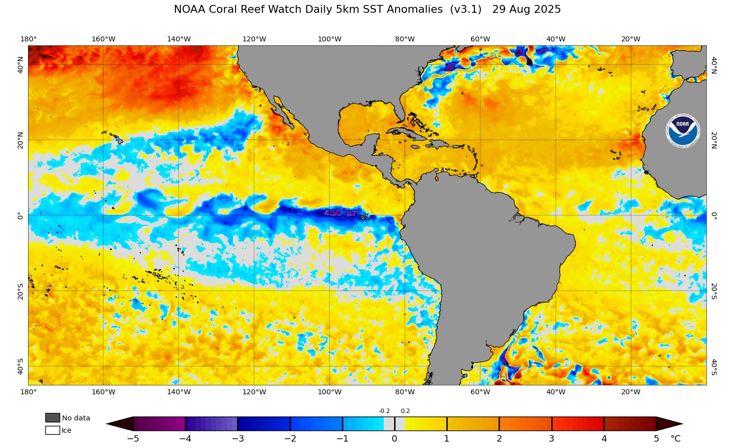 Conforme o último boletim semanal da NOAA, a anomalia de temperatura da superfície do mar era de -0,4ºC na denominada região Niño 3.4, no Pacífico Equatorial Central, que é usada oficialmente para definir se há El Niño ou La Niña e qual sua intensidade. O valor é de neutralidade.