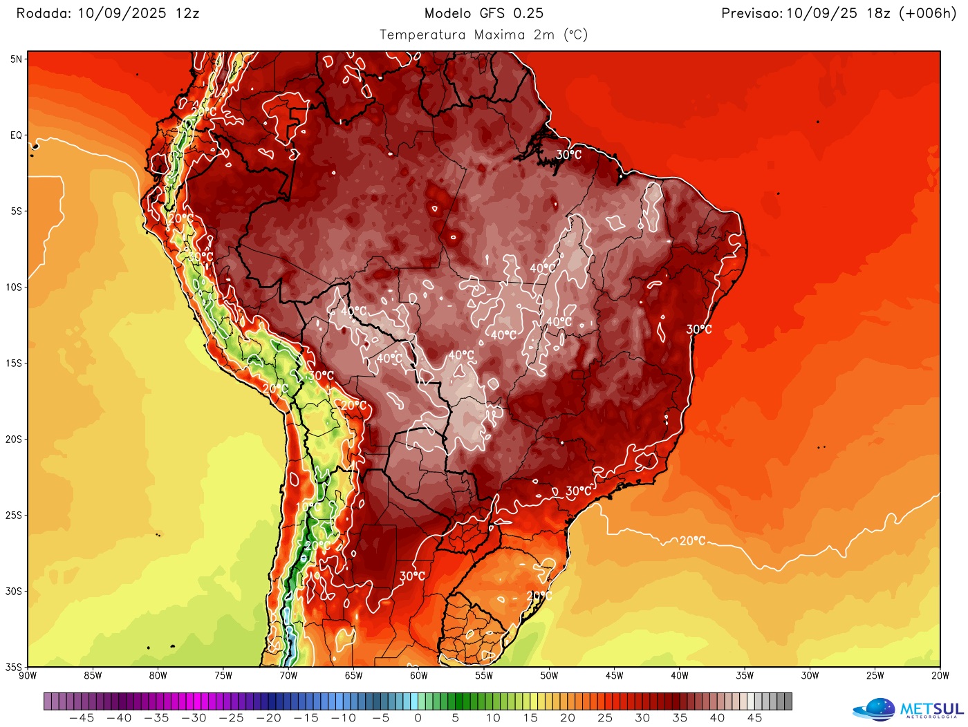 De acordo com levantamento da MetSul Meteorologia, a partir de dados de estações do Instituto Nacional de Meteorologia, as máximas nesta quarta-feira ficaram perto e acima dos 40ºC em dez estados, no Centro-Oeste, no Sudeste e no Nordeste do Brasil.