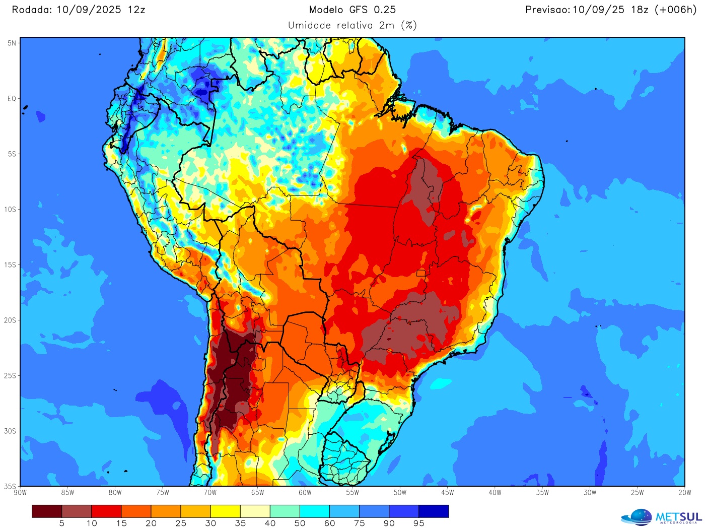 Como é comum nesta época do ano, no final da estação seca, os índices de umidade do ar são muito baixos na porção central do Brasil, em particular entre o Centro-Oeste, áreas não costeiras do Sudeste e o interior do Nordeste.