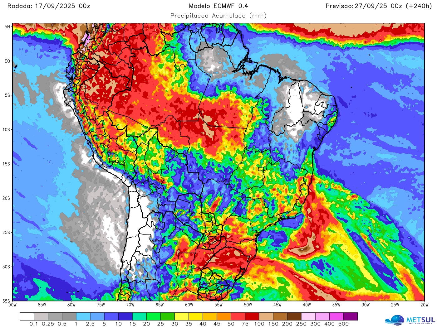 O mapa acima mostra a projeção de chuva para dez dias do modelo do Centro Meteorológico Europeu (ECMWF), que está disponível ao assinante (assine aqui) em nossa seção de mapas.