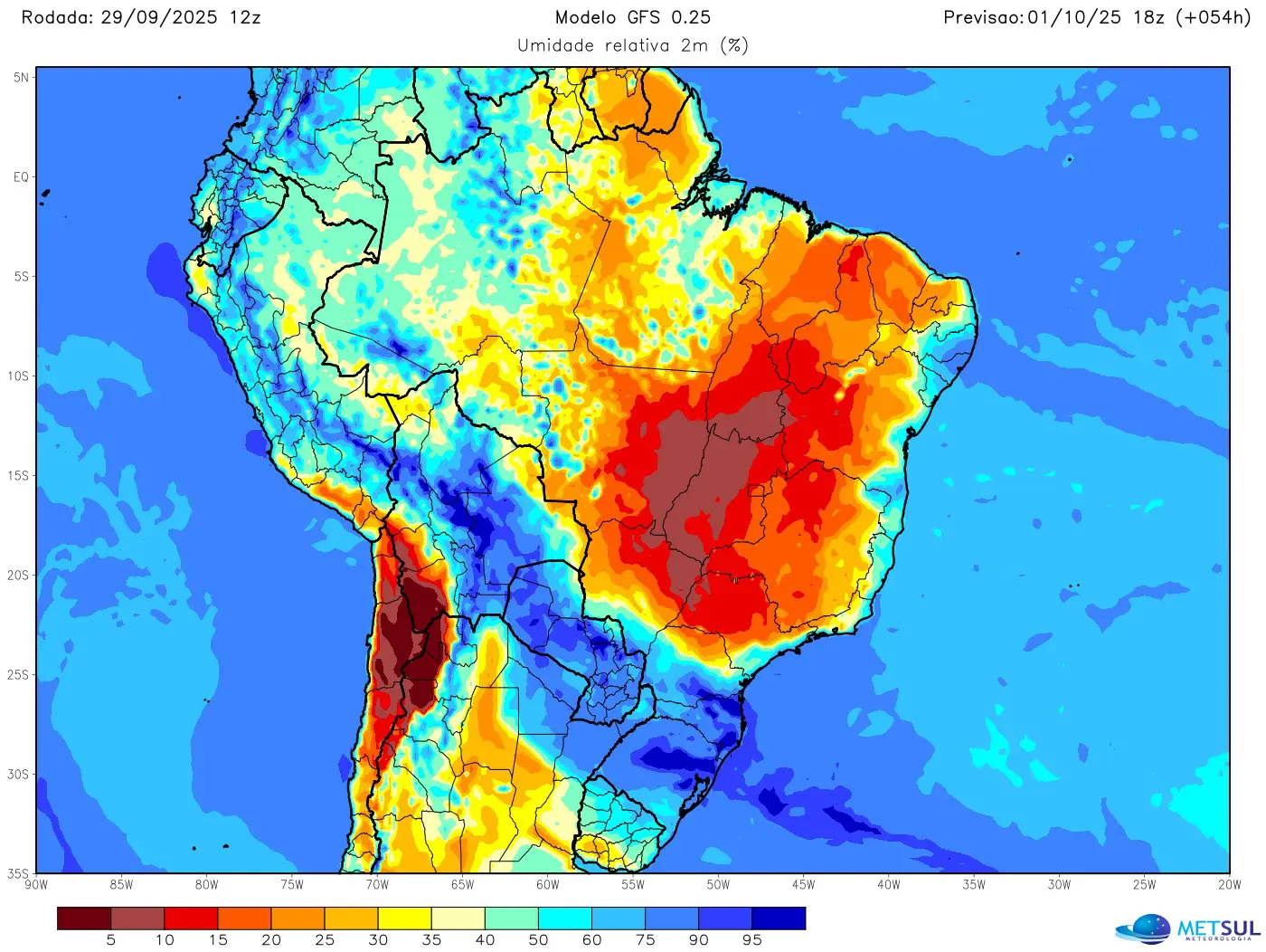 Mapa de umidade prevista para a primeira tarde de outubro mostra a atmosfera por demais seca no interior de São Paulo, Goiás, Oeste de Minas Gerais, Norte do Mato Grosso do Sul, Tocantins, grande parte do Mato Grosso e extensa área do Nordeste do Brasil com calor intenso enquanto no Sul do Brasil a atmosfera estará mais úmida com sol, nuvens e chuva | METSUL