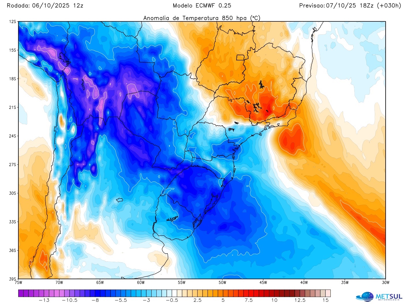 Uma massa de ar frio avança na retaguarda da frente fria e favorece o declínio acentuado da temperatura. Esta massa de ar frio vai aliviar trazer temperatura baixa para outubro nas próximas madrugadas no Sul e oferecer um alívio do calor em áreas do Mato Grosso do Sul, Mato Grosso, São Paulo e Rio de Janeiro.