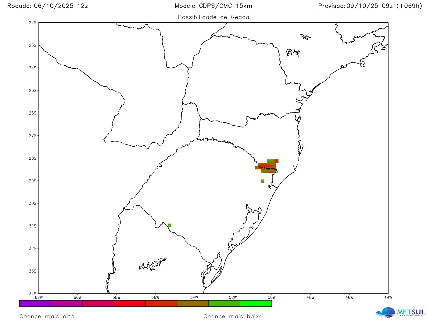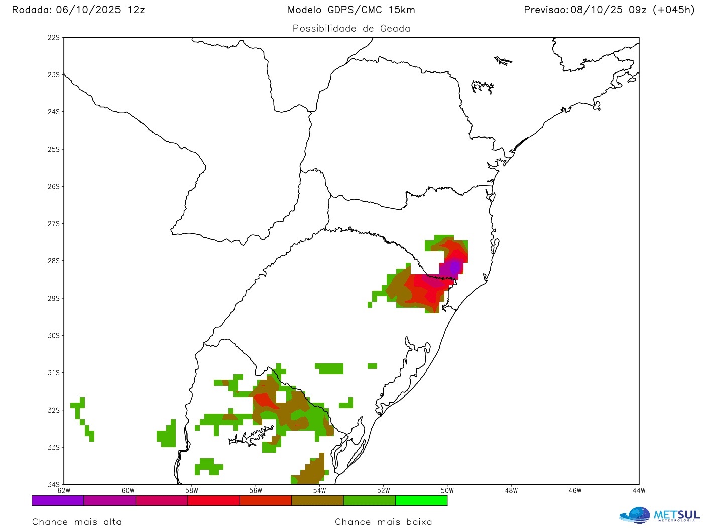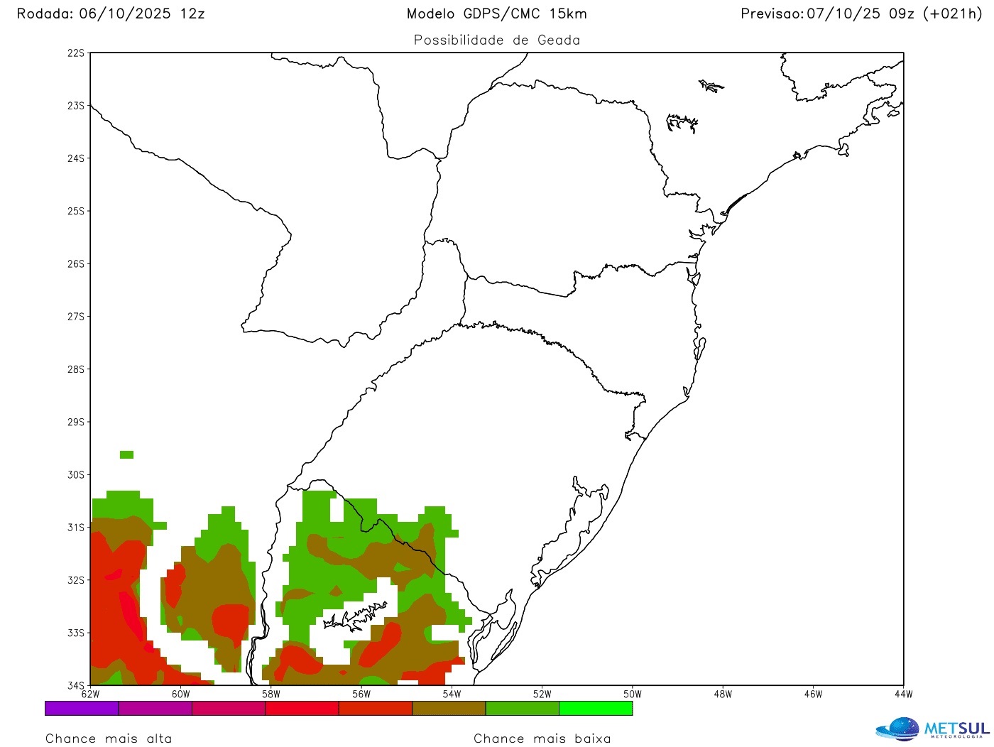 Uma vez que não se trata de uma massa de ar frio intensa e em se tratando de outubro não deve se esperar geada generalizada. Deve gear nos locais tradicionais em que o fenômeno é mais comum, notadamente as áreas de maior altitude do Rio Grande do Sul e de Santa Catarina.
