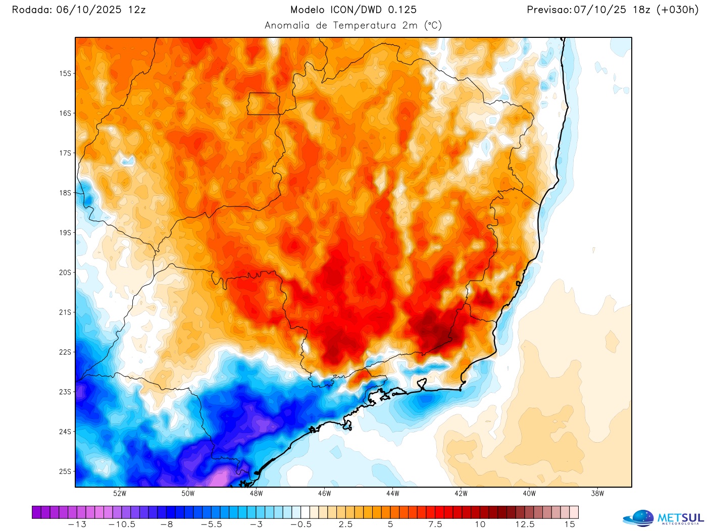 Mapa de anomalia de temperatura (desvio da média) do modelo alemão Icon par a tarde desta terça-feira no Sudeste do Brasil | METSUL
