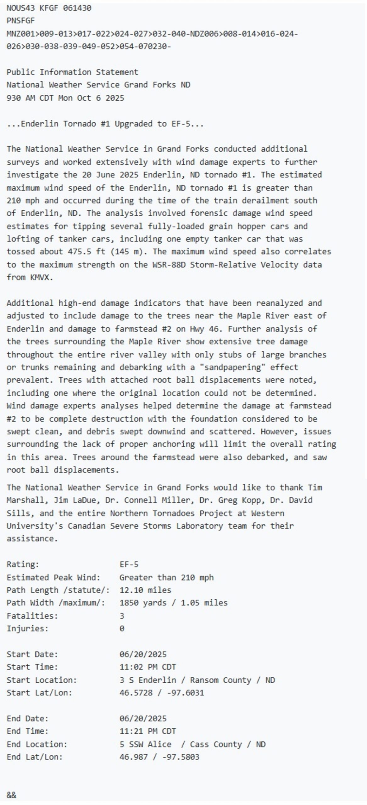 O tornado de Enderlin, Dakota do Norte, em 20 de junho de 2025, foi reclassificado como EF5, o nível máximo na escala de intensidade, pelo escritório do Serviço Nacional de Meteorologia (NWS) de Grand Forks, que divulgou a atualização revista.