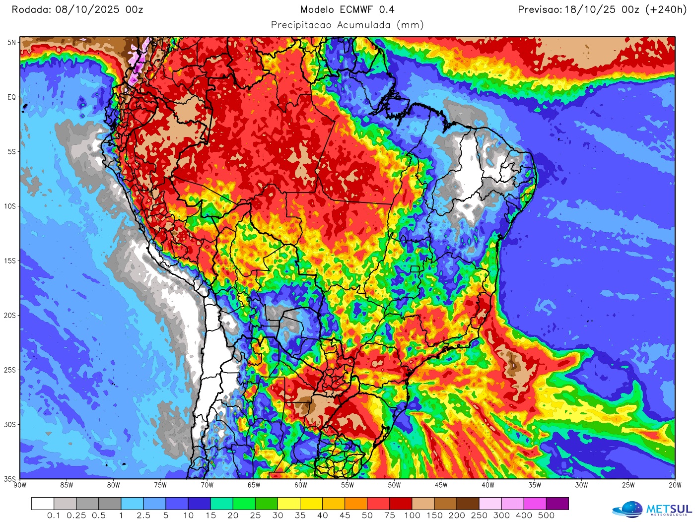 O mapa acima mostra a projeção de chuva para dez dias do modelo do Centro Meteorológico Europeu (ECMWF), que está disponível ao assinante (assine aqui) em nossa seção de mapas.