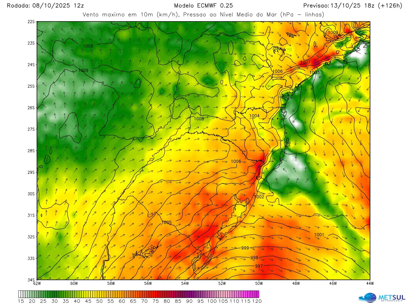 O vento na segunda-feira pode ser forte e com rajadas ainda no Leste de Santa Catarina e do Paraná, no estado de São Paulo, em áreas de Minas Gerais e do Rio de Janeiro. No estado catarinense, na Serra, na encosta da Serra e na costa as rajadas podem ser fortes a muito fortes.