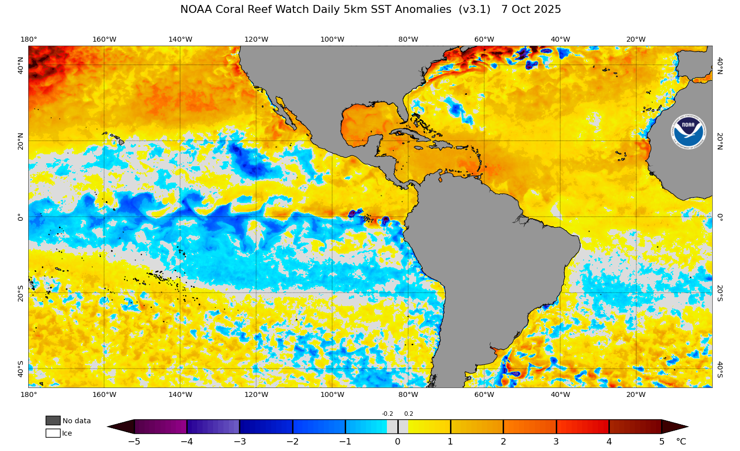 Hoje, conforme os dados da Administração Nacional de Oceanos e Atmosfera (NOAA), dos Estados Unidos, a anomalia de temperatura da superfície do mar no Pacífico Equatorial Central-Leste (região Niño 3.4) está em -0,5ºC.