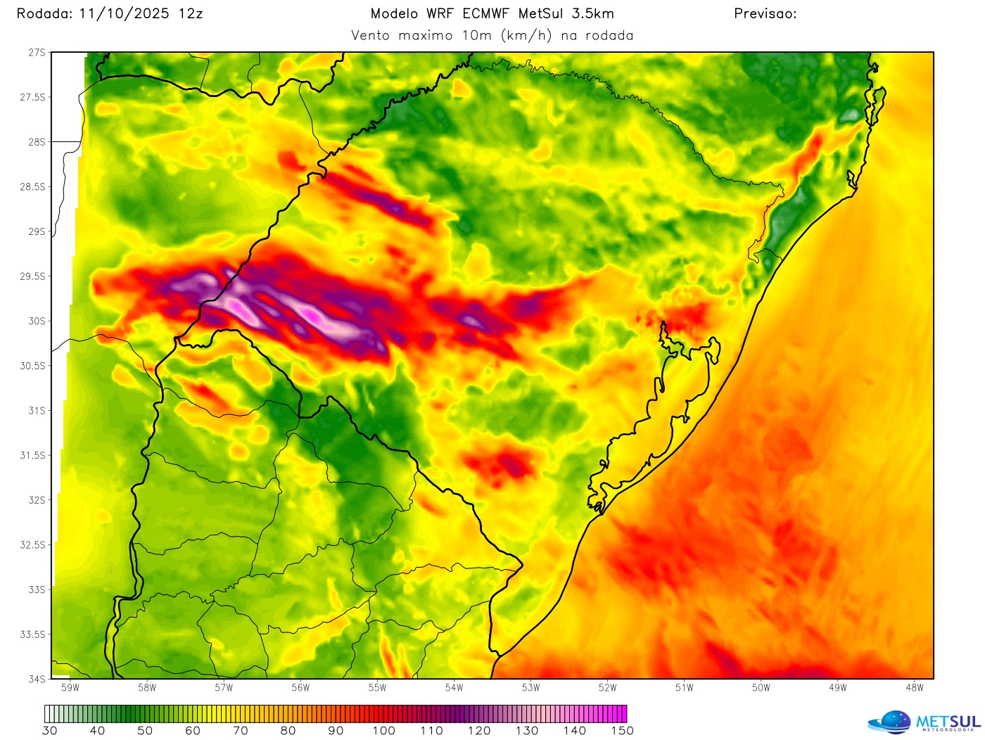 Preocupa a projeção de vento máximo (acima) do nosso modelo de alta resolução WRF inicializado com o modelo europeu, cuja rodada que ingressou no começo da noite deste sábado indicou risco de vendavais intensos, especialmente em pontos do Centro para o Oeste gaúcho.