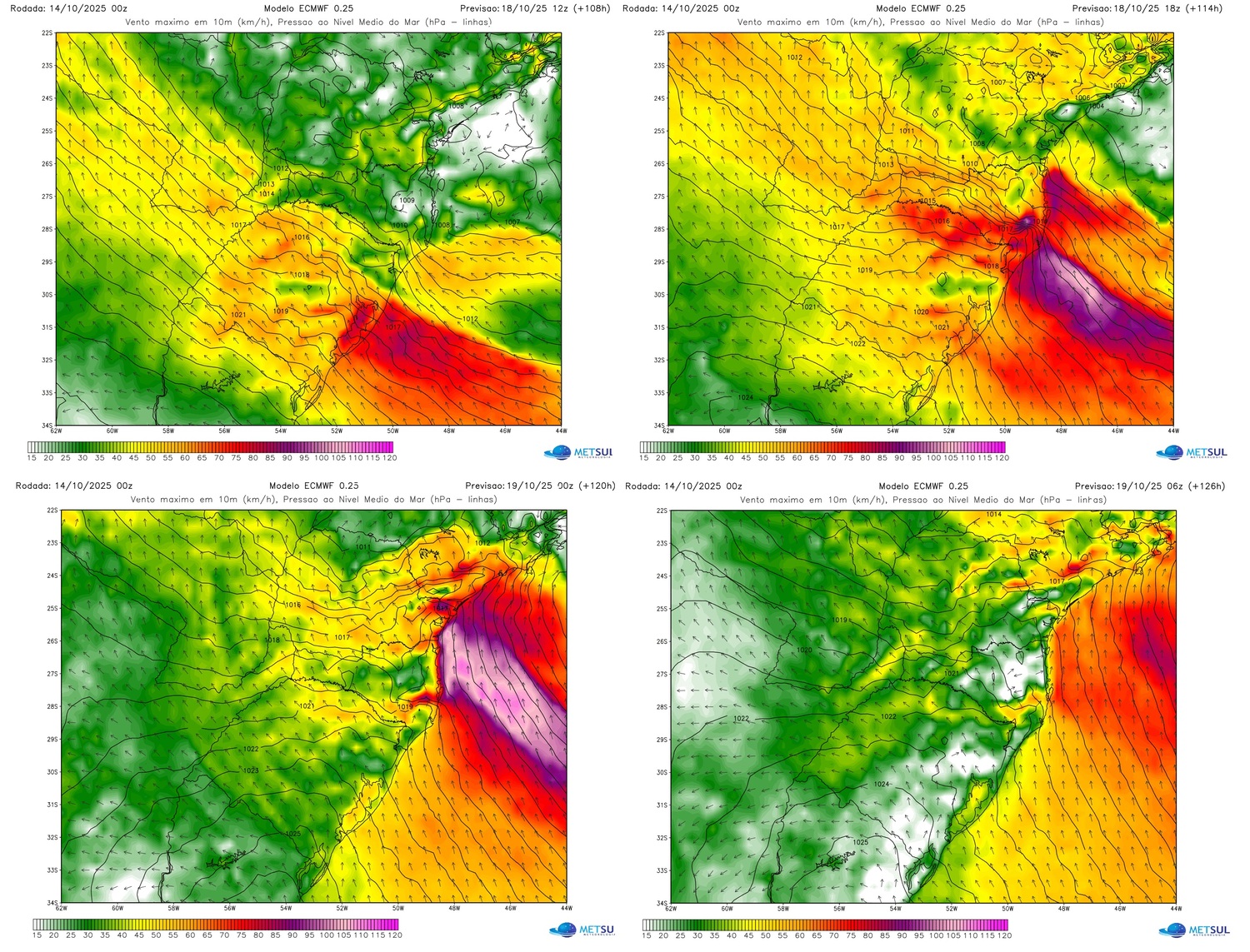 O campo de vento forte a intenso vai atingir primeiro o Rio Grande do Sul no sábado e se deslocar rapidamente pelo Leste catarinense e paranaense até atingir áreas perto da costa em São Paulo e no Rio de Janeiro.