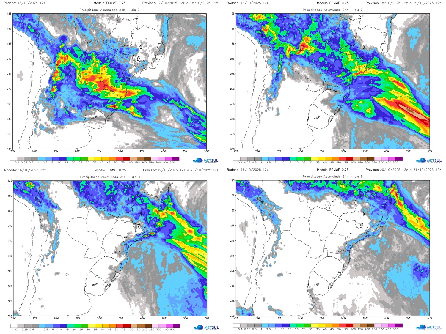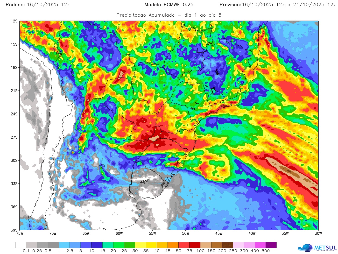 O mapa abaixo, do modelo do Centro Meteorológico Europeu (ECMWF), traz a projeção de chuva acumulada para os próximos cinco dias no Centro-Sul do Brasil em que se vê como a precipitação deve ser generalizada. No caso do Sul, na precipitação, à chuva da frente se soma a que vai ser causada hoje por um centro de baixa pressão atmosférica.