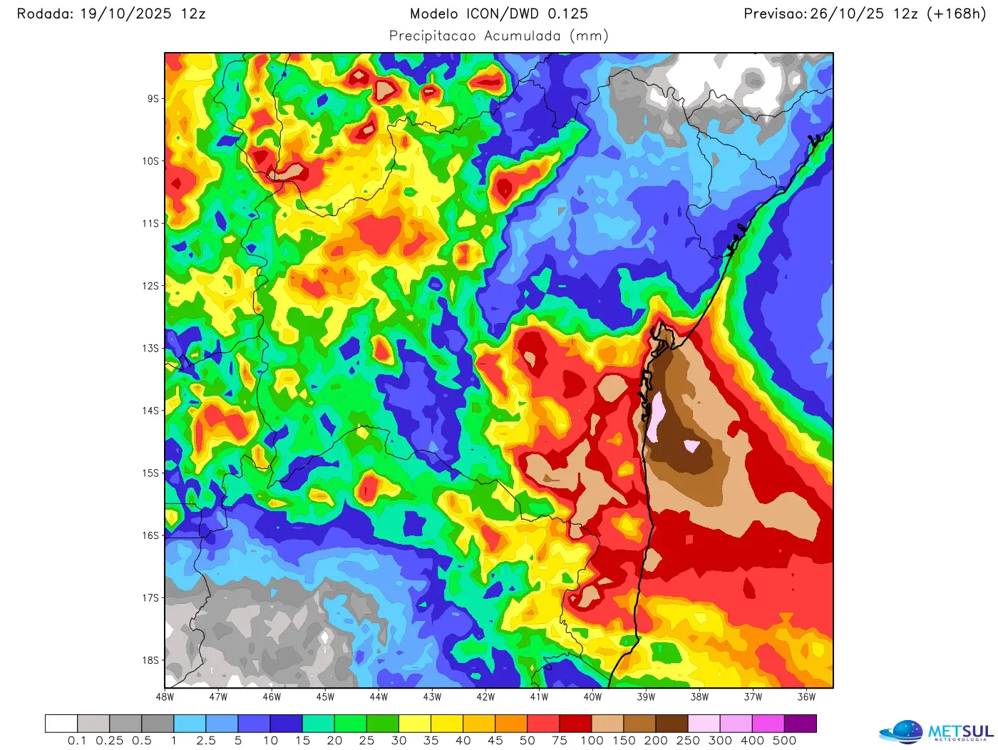 A MetSul Meteorologia adverte para um cenário de perigo por excesso de chuva com volumes muito altos a localmente extremos com possibilidade de transtornos significativos para as populações das áreas afetadas.