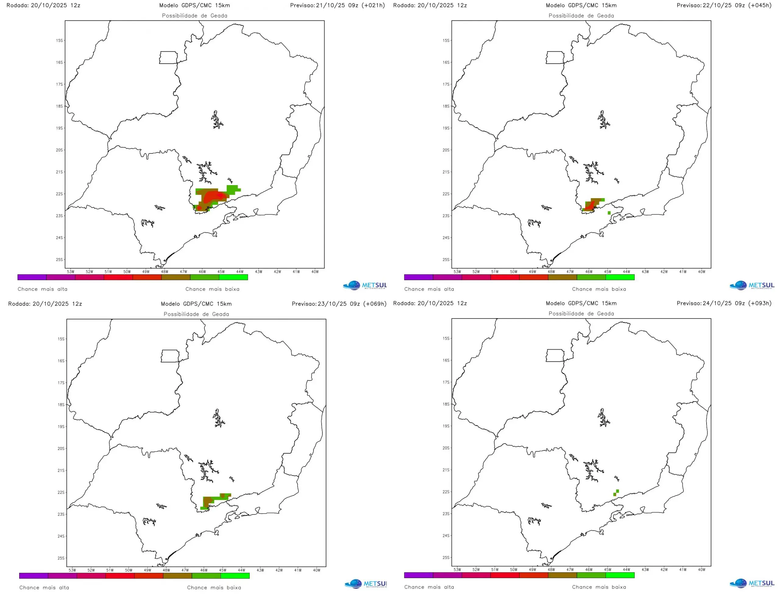 Os mapas acima mostram a projeção de probabilidade de geada do modelo canadense que indica chance de gear todos os dias até sexta-feira no Sul mineiro, em mais locais entre esta terça e a quarta e de forma muito isolada na sexta.