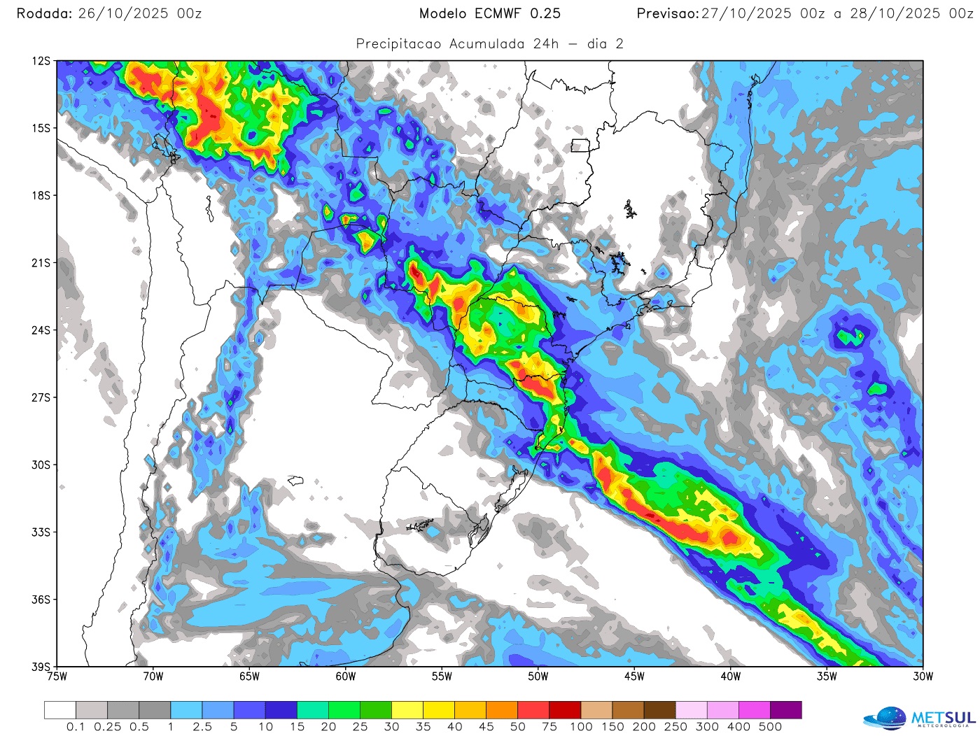 Como se observa no mapa do modelo matemática europeu, a frente fria organiza um canal de umidade vindo da região amazônica com chuva em ao menos nove estados neste começo de semana.