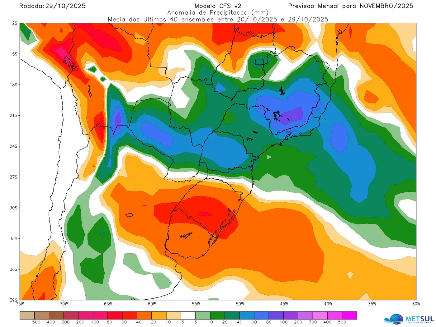 Mapa de anomalia de precipitação no Centro-Sul do Brasil em novembro prevista pelo modelo norte-americano CFS. O mapa não necessariamente representa o prognóstico da MetSul e é meramente ilustrativo. | METSUL