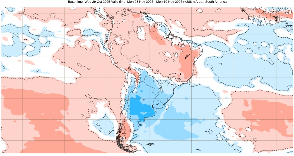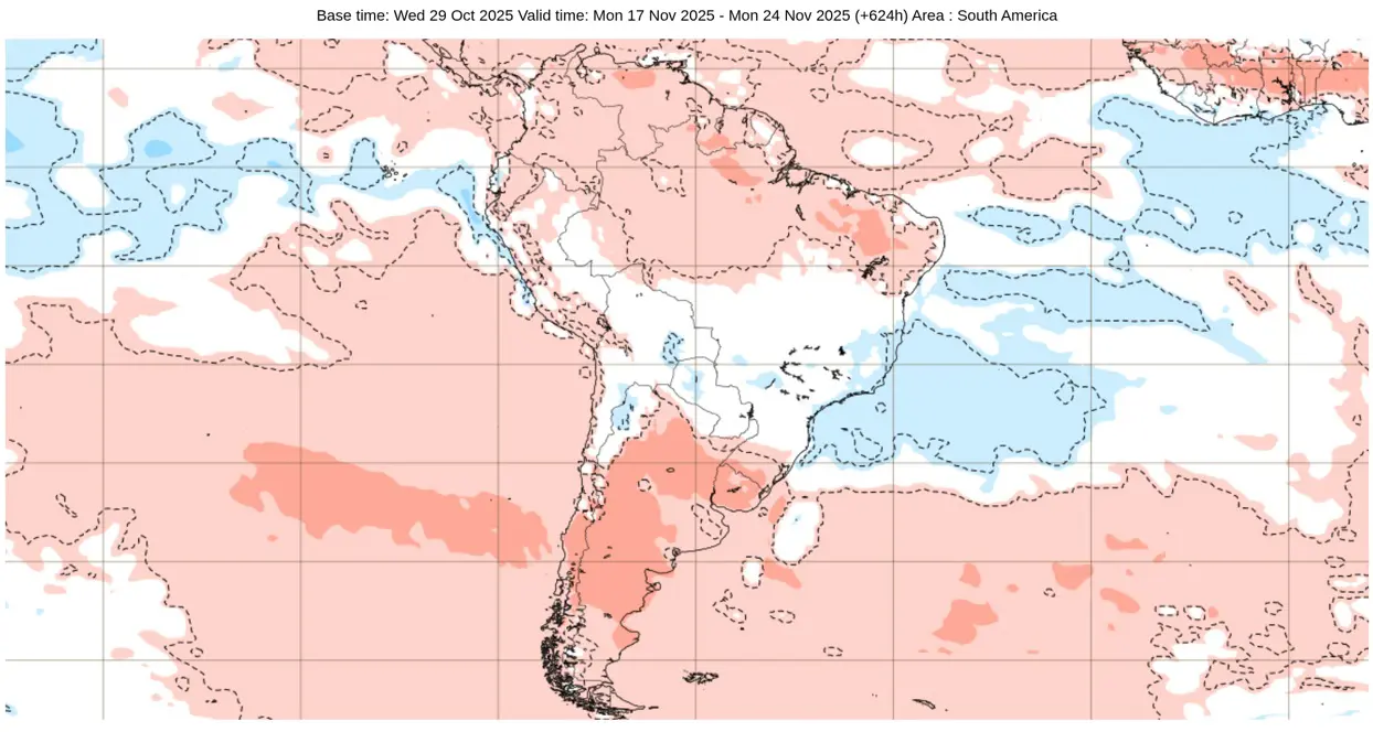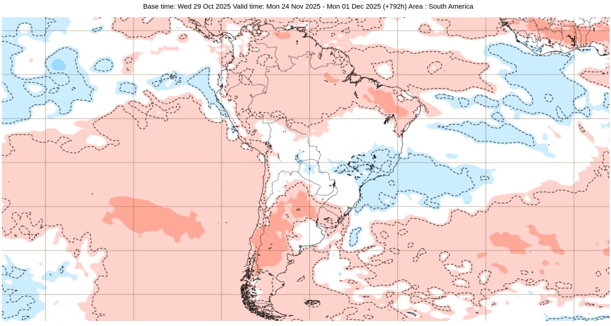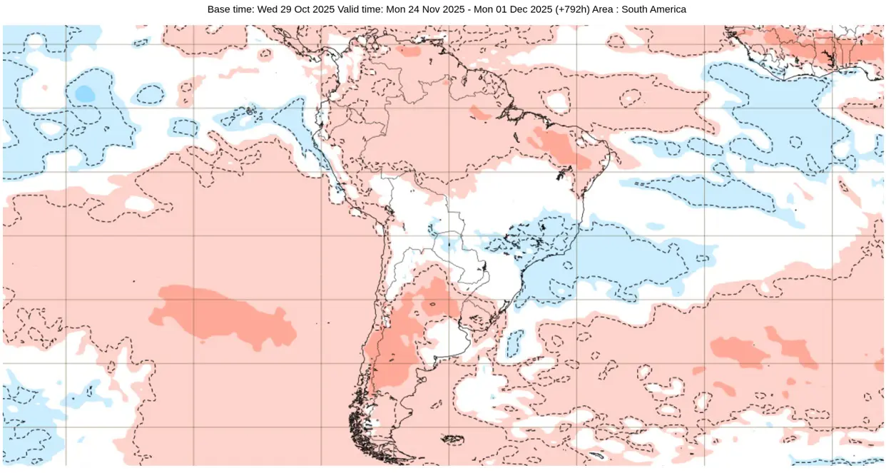 No decorrer de novembro, há margem para um resfriamento adicional. Assim, o cenário indica que as condições oceânicas em patamar de La Niña devem persistir no penúltimo mês do ano, mas em patamar predominantemente de fraca intensidade.