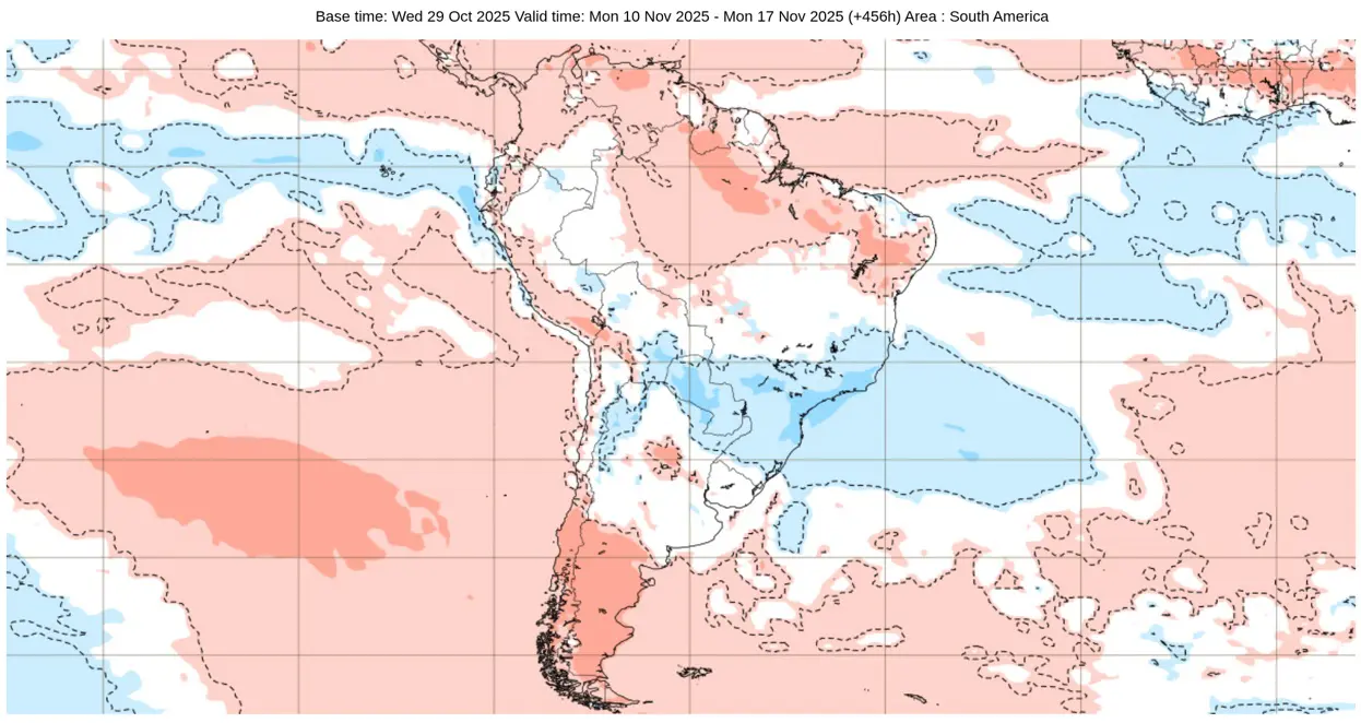 Novembro será um mês de temperatura abaixo da média na maior parte do Centro-Sul do território brasileiro, repetindo o padrão observado em outubro. Chuva frequente vai ser fator decisivo para moderar as temperaturas no Centro-Oeste e Sudeste, impedindo períodos mais secos e quentes prolongados.