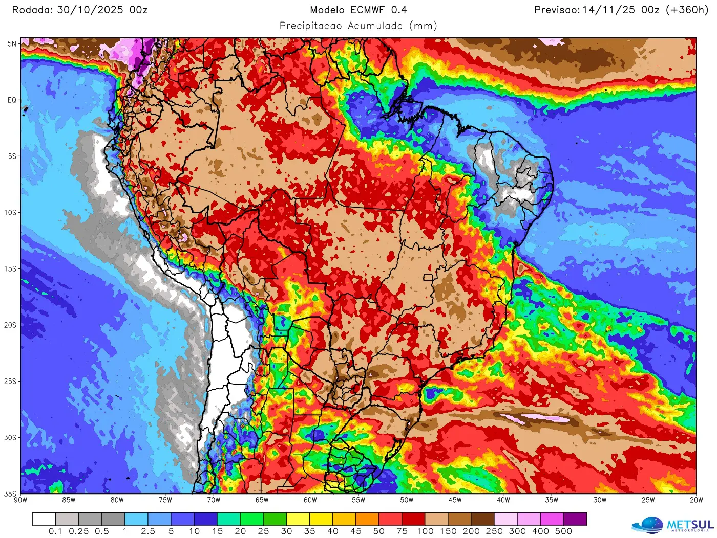 A primeira quinzena de novembro já terá volumes significativos em vários pontos do Centro-Sul do Brasil com marcas que podem ficar próximas e que eventualmente podem atingir a média histórica de chuva do mês inteiro em vários estados. O mapa a seguir mostra a projeção de chuva para a primeira metade do mês do modelo do Centro Meteorológico Europeu (ECMWF).