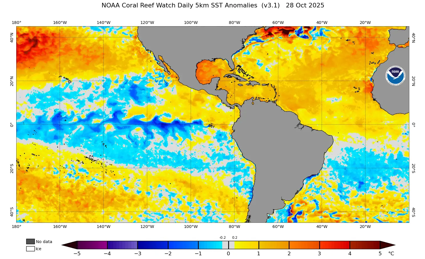 O último boletim semanal da Administração Nacional de Oceanos e Atmosfera (NOAA), dos Estados Unidos, indicou que a anomalia de temperatura da superfície do mar está em -0,6ºC na denominada região Niño 3.4, no Pacífico Equatorial Central. O valor está exatamente no limite inferior de La Niña de fraca intensidade (-0,5ºC a -0,9ºC).