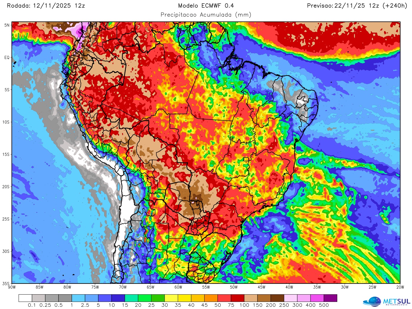 A chuva no Brasil nos próximos dez dias seguirá abrangente e com volumes localmente altos que podem passar de 100 mm em vários estados. Acumulados muito elevados e até localmente excessivos são esperados no Mato Grosso do Sul.