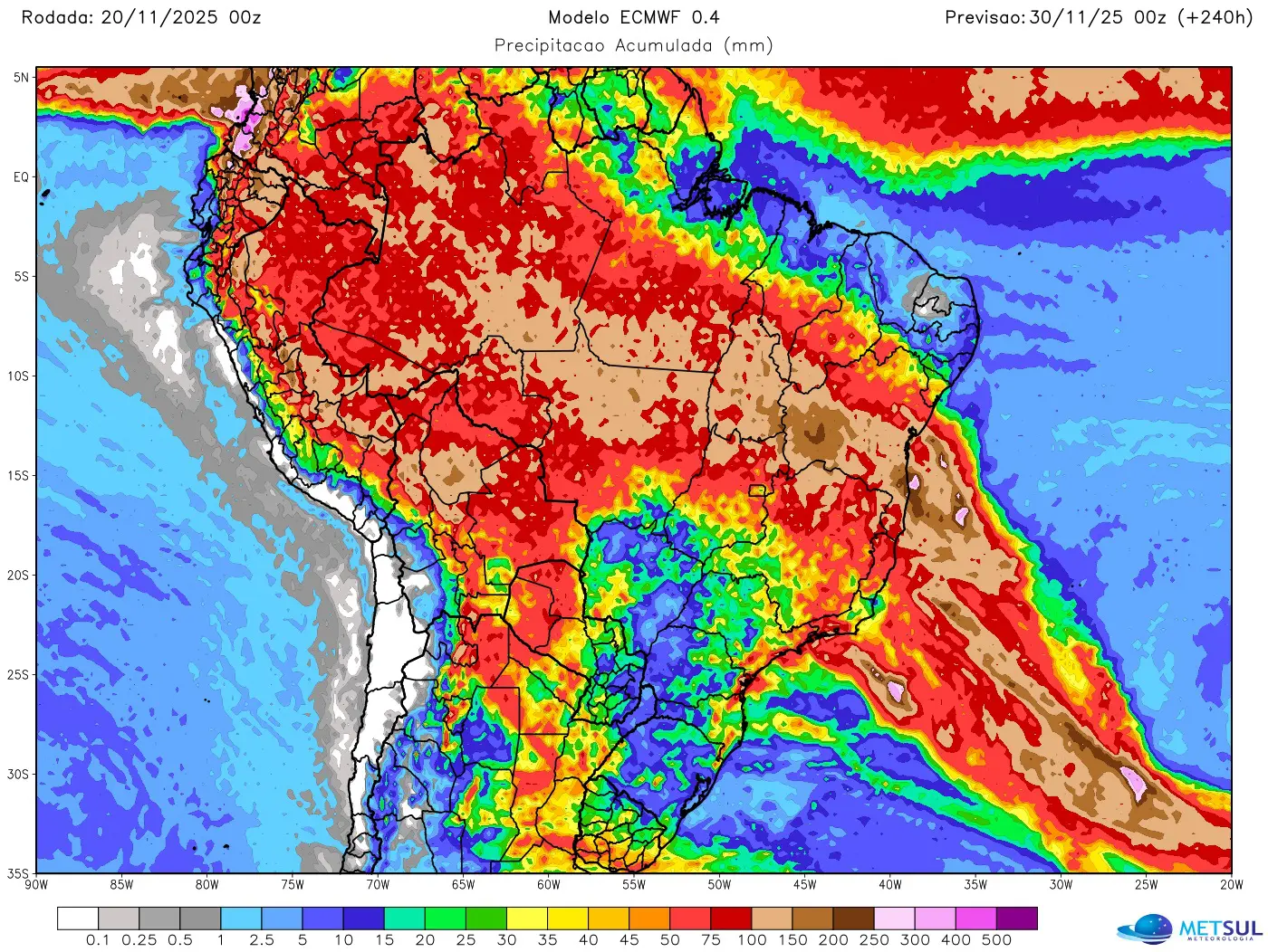 O mapa acima mostra a projeção de chuva para dez dias do modelo do Centro Meteorológico Europeu (ECMWF), que está disponível ao assinante (assine aqui) em nossa seção de mapas.