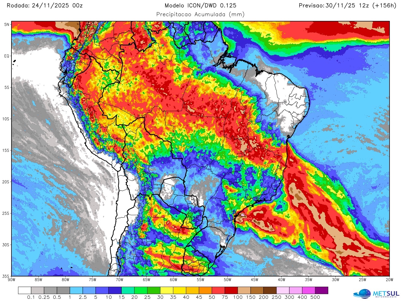 O mapa acima mostra a projeção de chuva para esta semana do modelo meteorológico Icon, do Deutscher Wetterdienst, o serviço meteorológico da Alemanha, e que pode ser consultado pelo nosso assinante na seção de mapas (assine aqui e tenha acesso a muitos mapas de chuva).