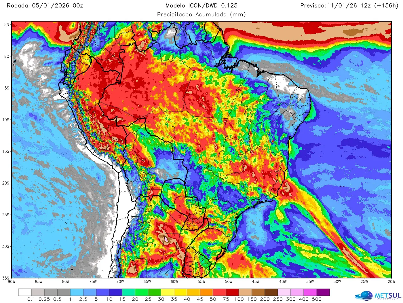 O mapa acima mostra a projeção de chuva para esta semana do modelo meteorológico Icon, do Deutscher Wetterdienst, o serviço meteorológico da Alemanha, e que pode ser consultado pelo nosso assinante na seção de mapas (assine aqui e tenha acesso a muitos mapas de chuva).