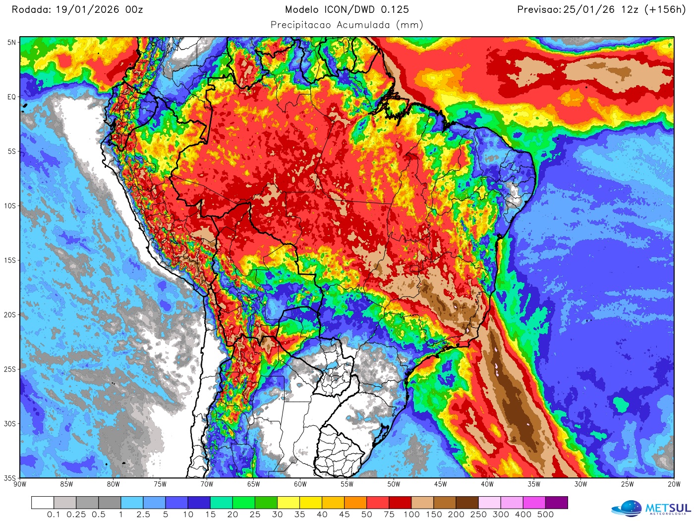 O mapa acima mostra a projeção de chuva para esta semana do modelo meteorológico Icon, do Deutscher Wetterdienst, o serviço meteorológico da Alemanha, e que pode ser consultado pelo nosso assinante na seção de mapas (assine aqui e tenha acesso a muitos mapas de chuva).