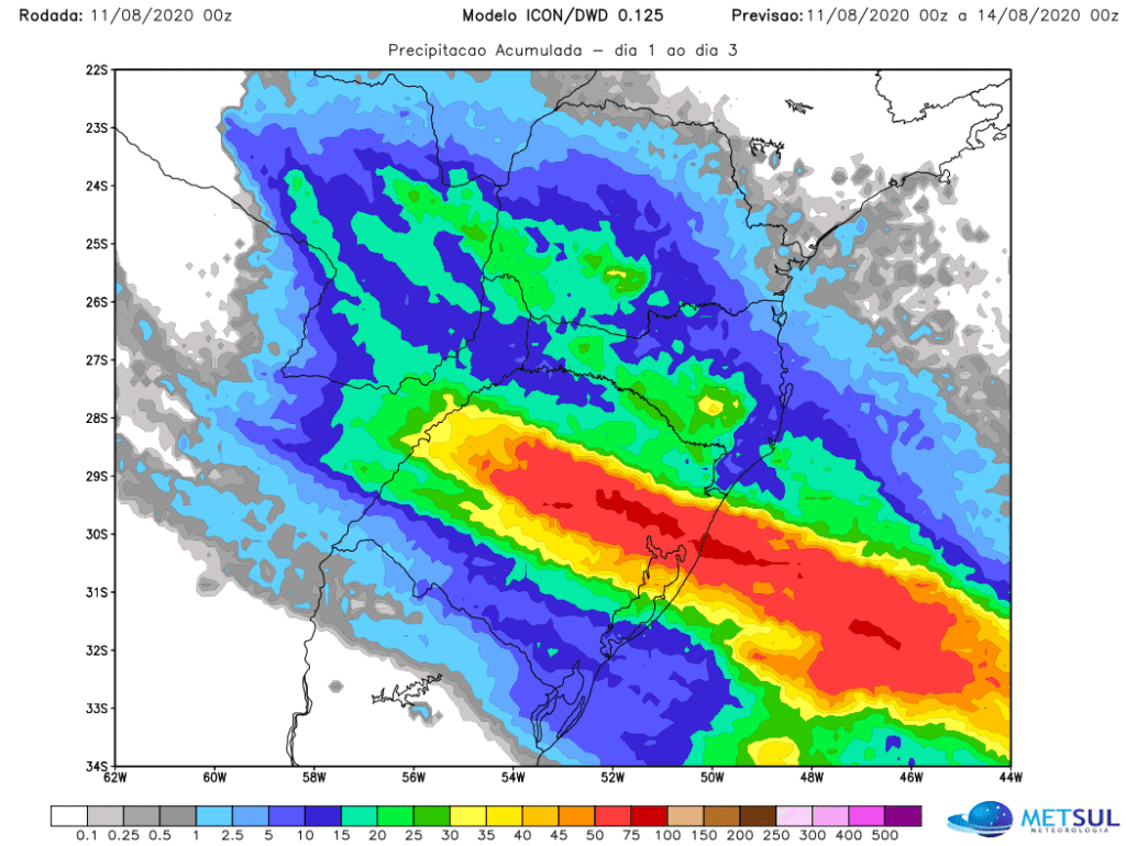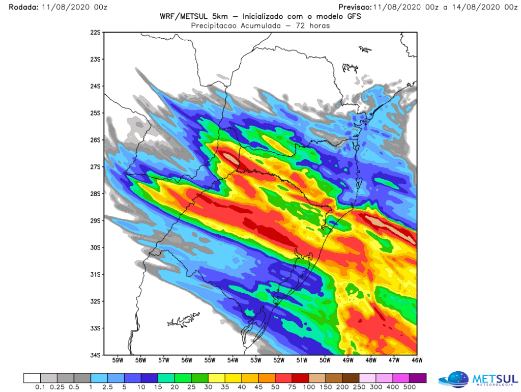 A MetSul Meteorologia adverte que a instabilidade deve se intensificar a partir da noite de hoje do Centro para o Norte gaúcho e que o pico de intensidade deve ocorrer durante a quarta-feira, antecipando-se chuva localmente volumosa e o risco de alguns temporais isolados com possibilidade de rajadas de vento forte isoladas e, sobretudo, granizo.