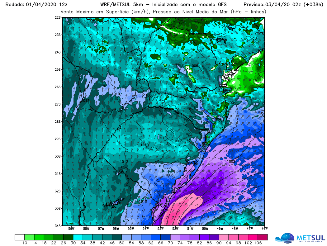 O ciclone que estará a Sudeste-Leste do Rio Grande do Sul deve trazer vento forte a intenso para parte do Estado nesta quinta, especialmente na segunda metade do dia, e ainda em parte da sexta-feira, mais entre a madrugada e de manhã. Como é normal em ciclones extratropicais, o vento afeta mais o Sul e o Leste gaúcho e as rajadas esperadas devem ficar na maioria das áreas destas regiões entre 60 km/h e 80 km/h, mas no Litoral – sobretudo o Sul – e as áreas de lagoas e entorno as rajadas podem atingir de 80 a 100 km/h. Por isso, a navegação é desaconselhada.