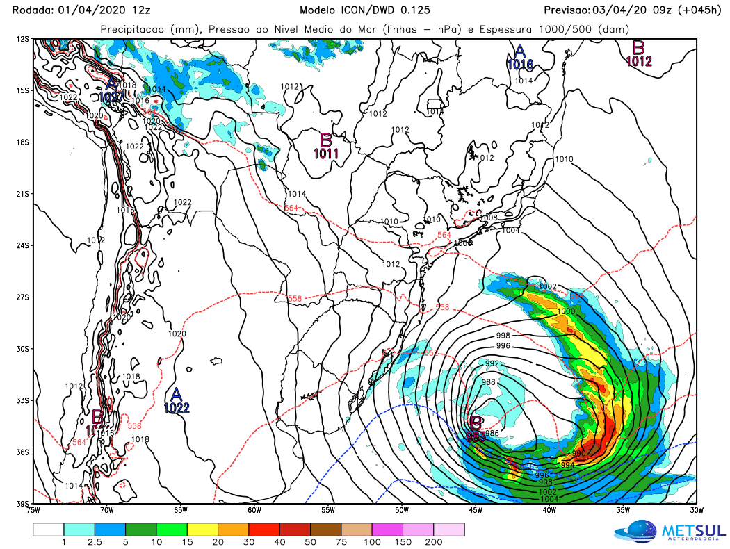 Um ciclone extratropical está em formação na foz do Rio da Prata e afetará principalmente o Sul e o Leste do Uruguai e o Rio Grande do Sul. O sistema avança para Leste rumo ao Atlântico e se intensificará à medida que se distancia da costa.