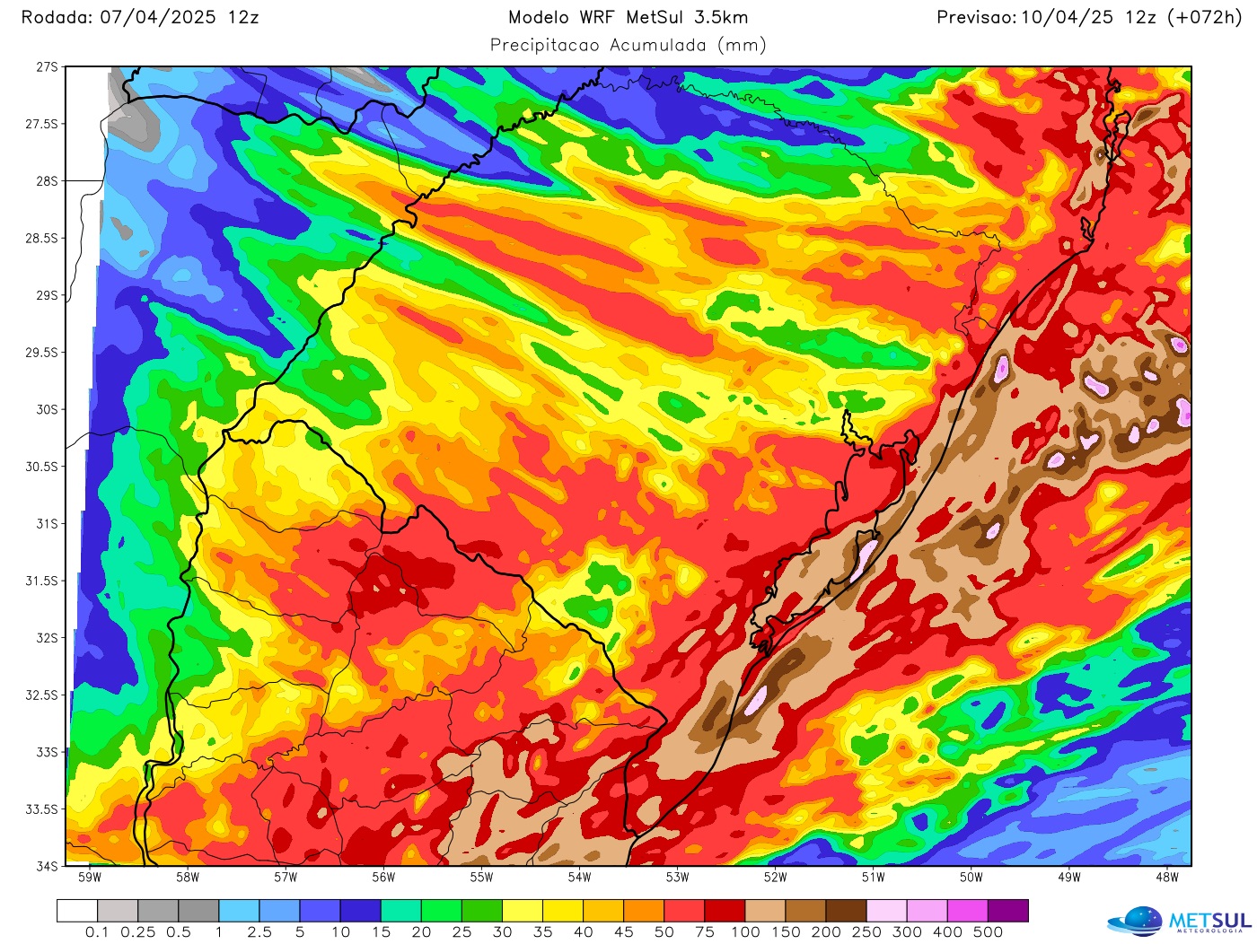 Os volumes de chuva em muitos pontos da costa gaúcha, do Norte ao Sul, devem ficar perto e acima dos 100 mm, mas os nossos modelos de alta resolução apontam o risco de em trechos da faixa costeira chover até 200 mm a 250 mm ou mais.