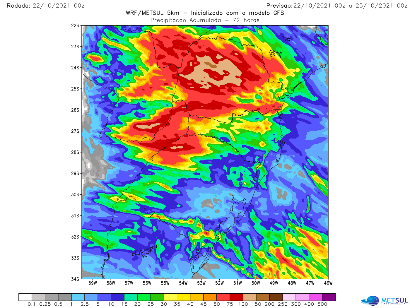 O mapa acima mostra a projeção de chuva do modelo WRF até 21h de domingo. O modelo está disponível ao assinante na seção de mapas. Conforme o indicado no mapa, os mais altos volumes devem ocorrer no período no Paraná com marcas acima de 100 mm e registros em alguns pontos acima de 150 mm, entretanto vários locais da Metade Norte gaúcha e de Santa Catarina podem ter registros acima de 50 mm.