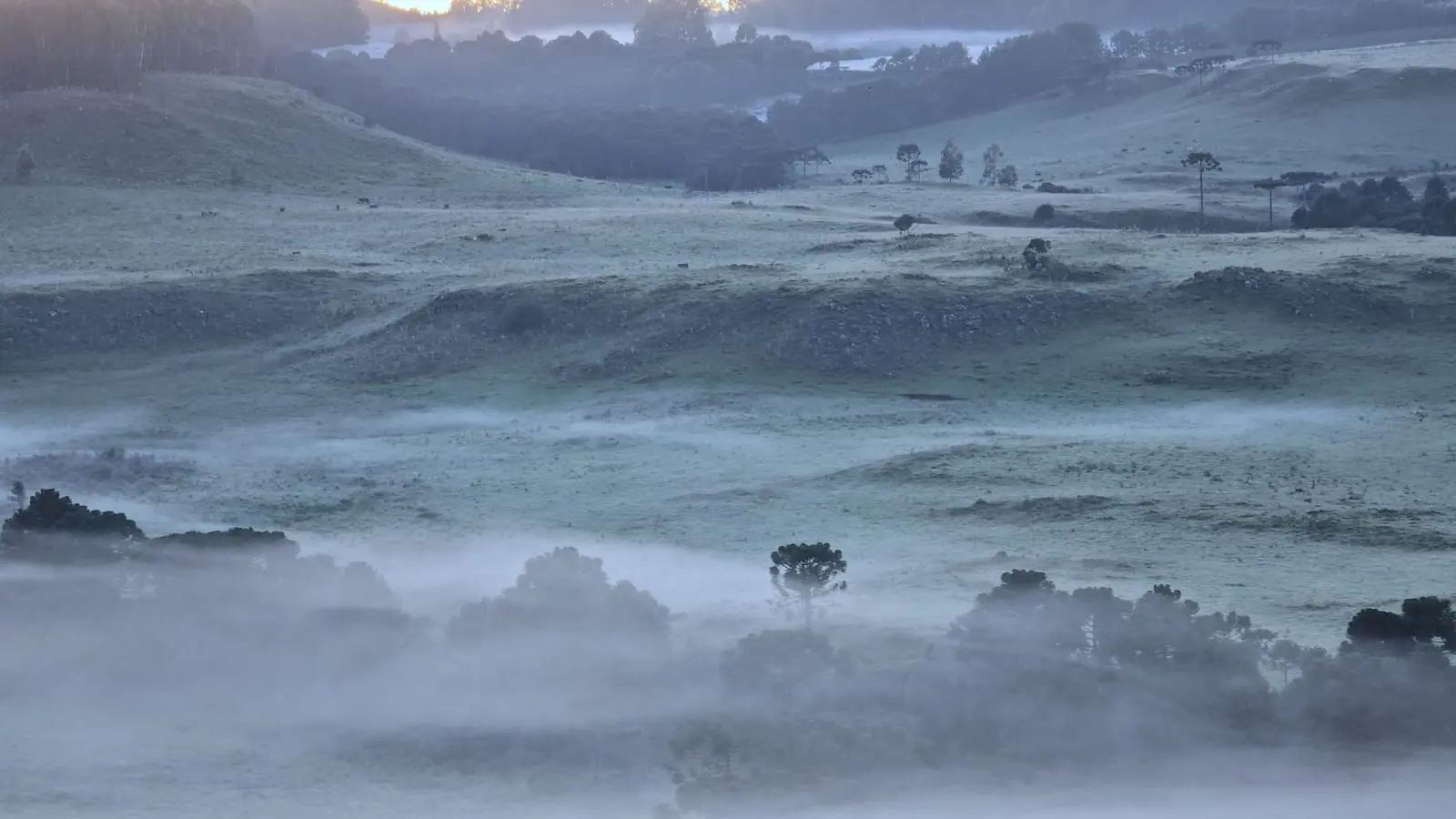 Santa Catarina também experimentou um amanhecer muito frio para a época do ano nesta segunda-feira com formação de geada nos campos de São Joaquim a mínimas de até 1ºC na região do Planalto Sul.