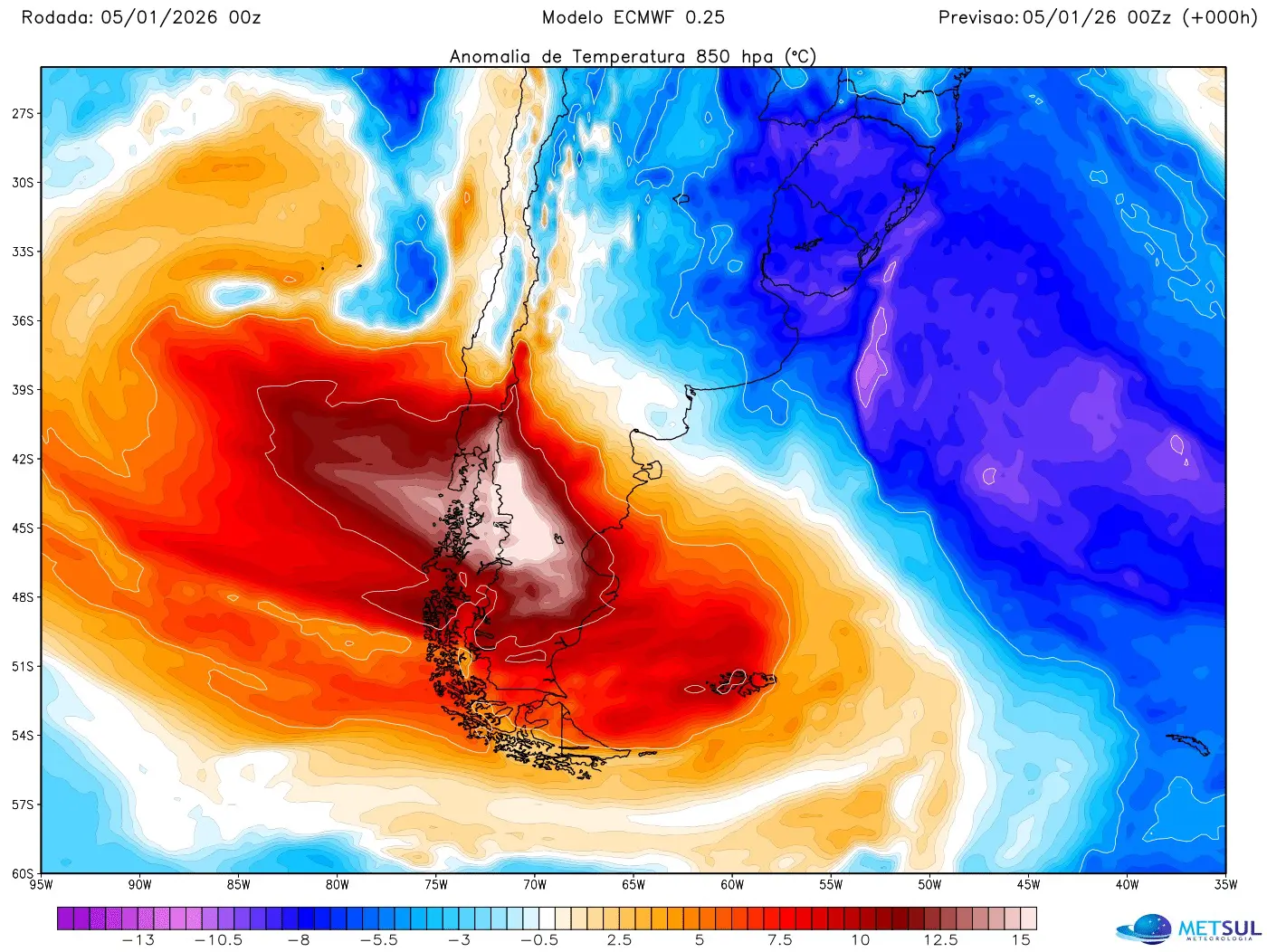 No Sul do continente, as máximas ontem na Patagônia da Argentina atingiram ontem 37,3ºC em Bolsón; 35ºC em Paso de Indios; 34,5ºC em Gobernador Gregores; 34,3ºC em Perito Moreno; e 31,9ºC em Bariloche.