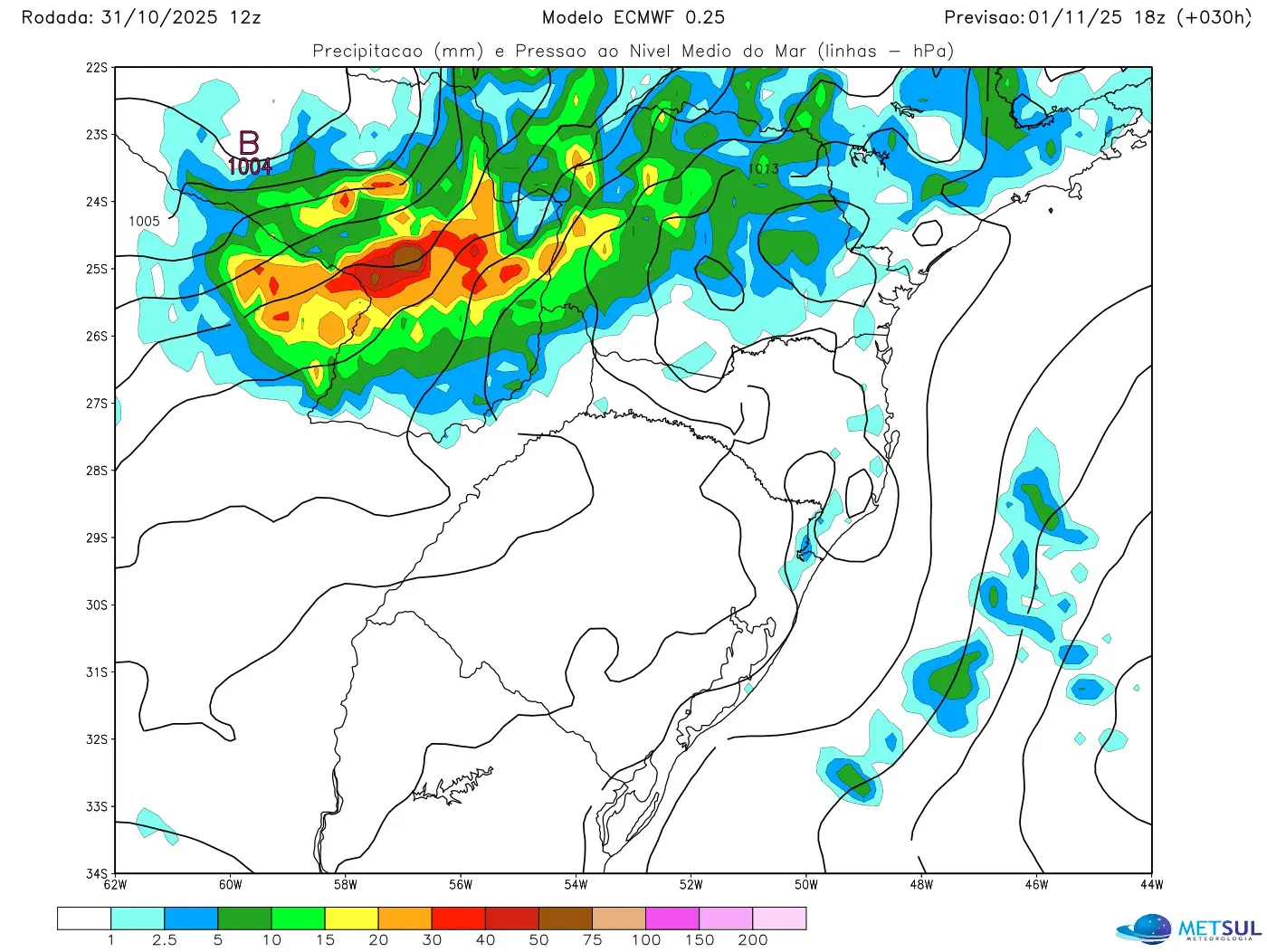 Baixa pressão vai trazer chuva forte e temporais no país vizinho com a instabilidade avançando para o Sul do Brasil peka projeção do modelo europeu (ECMWF) | METSUL