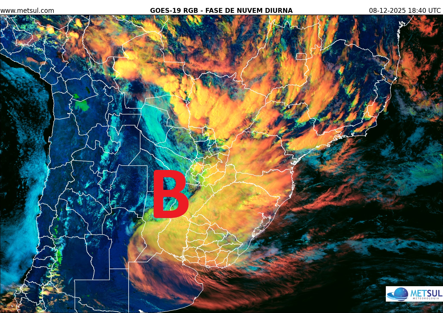 Baixa pressão (B) no Nordeste da Argentina forma muitaas áreas de instabilidade entre o Sul, Centro-Oeste e o Sudeste nesta tarde | METSUL